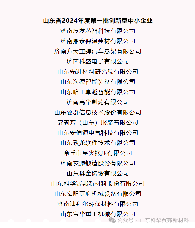 近日,山东省工业和信息化厅公布了山东省2024年度第一批创新型中小企业名单和专精特新中小企业名单。山东科华赛邦新材料股份有限公司成功入选。